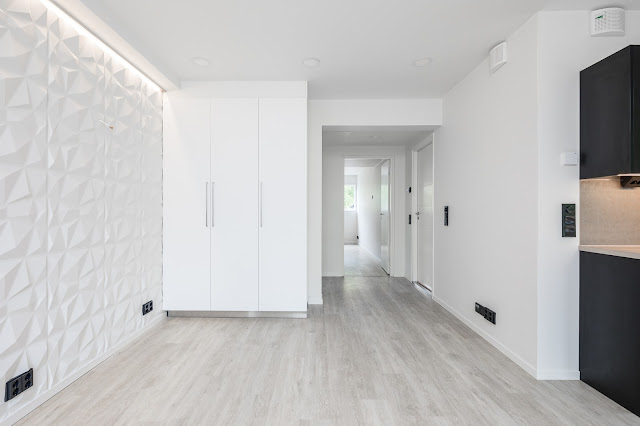 Valoisa asunto näyttävillä tummilla pinnoilla.